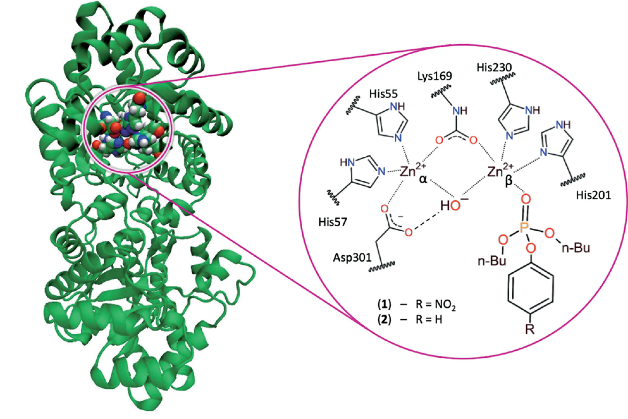 Рис. 2. Слева: Структура фосфотриэстеразы из бактерии Pseudomonas diminuta (Pd-PTE) – атомы активного центра показаны сферами. Справа: субстрат в активном центре Pd-PTE, пунктирными линиями показаны координационные связи катионов цинка, штриховой линией – водородная связь каталитического гидроксид аниона и аминокислотного остатка Asp301