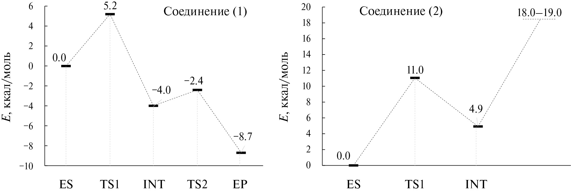 Для этого были взяты интермедиаты реакции гидролиза соединений (1) и (2) в активном центре Pd-PTE, полученные из КМ/ММ-МД, в сольватной оболочке, ограниченной молекулами воды, расположенными на расстоянии не более 4 Å от макромолекулы белка и субстрата. Оптимизация КМ/ММ была выполнена с использованием программного обеспечения Tcl ChemShell [37] с эффективным оптимизатором DL-FIND [38] и программным пакетом квантовой химии TURBOMOLE [39]. Квантовая подсистема и методы ее описания были выбраны аналогично предыдущему этапу.