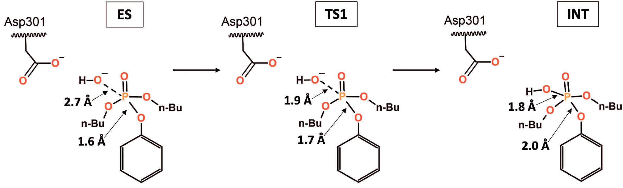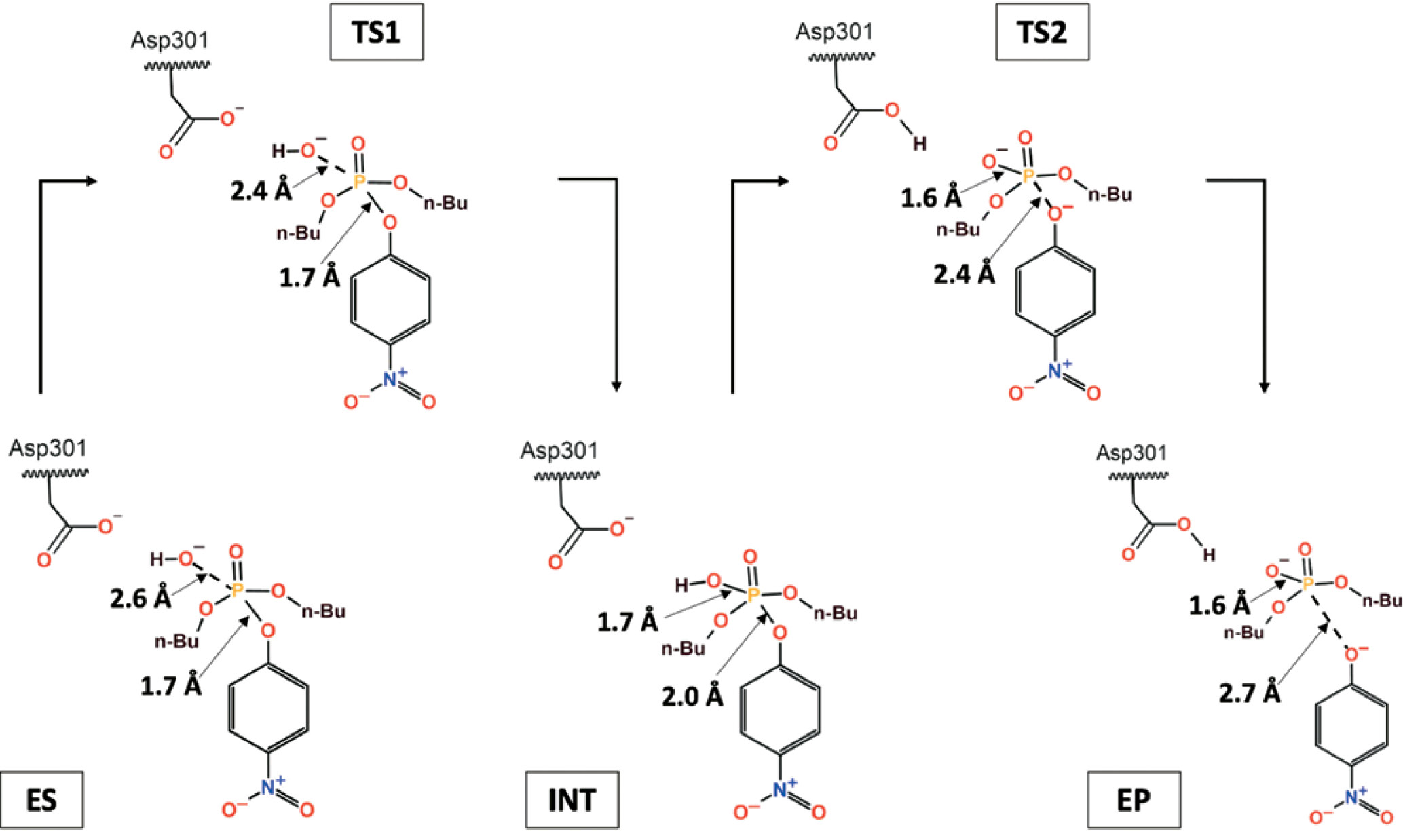 На рис. 6 представлены стационарные точки для первой стадии гидролиза дибутилфенилфосфата. Структуры фермент-субстратных комплексов и интермедиатов для гидролиза дибутил-4-нитрофенилфосфата и дибутилфенилфосфата схожи. В фермент-субстратных комплексах расстояние нуклеофильной атаки составляет 2.6 и 2.7 Å соответственно. Образование интермедиатов сопровождается уменьшением расстояния между фосфором и кислородом гидроксид-аниона до 1.7 и 1.8 Å, а расстояние P-OLG составляет 2.0 Å. Существенные различия наблюдаются в структурах первого переходного состояния: в случае дибутилфенилфосфата нуклеофил подходит на более короткое расстояние (1.9 Å), чем в случае дибутил-4-нитрофенилфосфата (2.4 Å). Несмотря на это, дальнейшего разрыва связи P-OLG в дибутилфенилфосфате не происходит.