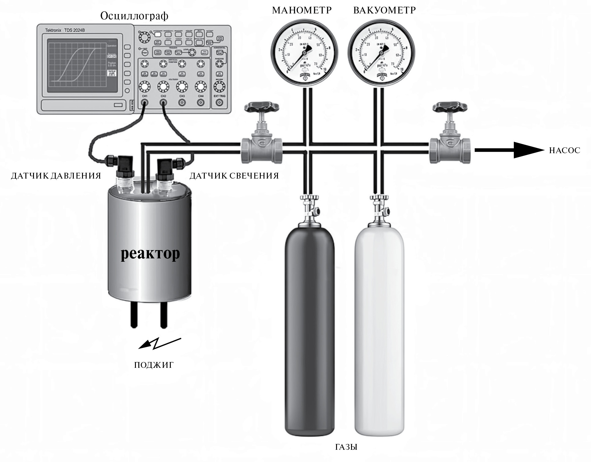 На рис. 1 представлена схема стенда, содержащего вакуумный пост и откачиваемый цилиндрический замкнутый реактор из нержавеющей стали объемом 3.2 л и диаметром 12.6 см, снабженный пьезоэлектрическим датчиком давления и фотодиодом. В качестве датчика давления использовался датчик 113В24 SN LM 47820 фирмы PCB PIEZOTRONICS (High frequency ICP® pressure sensor, 1000 psi, 5 мВ/psi, 0.218 dia. diaphragm, accel. comp.) Пробег пламени регистрировался по хемилюминесценции фотодатчикa ФД-11К (интервал длин волн спектральной чувствительности – от 500 до 1150 нм).