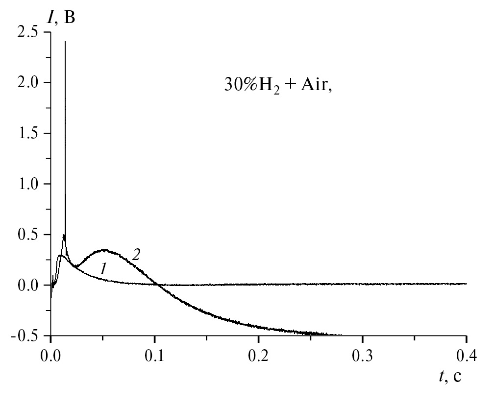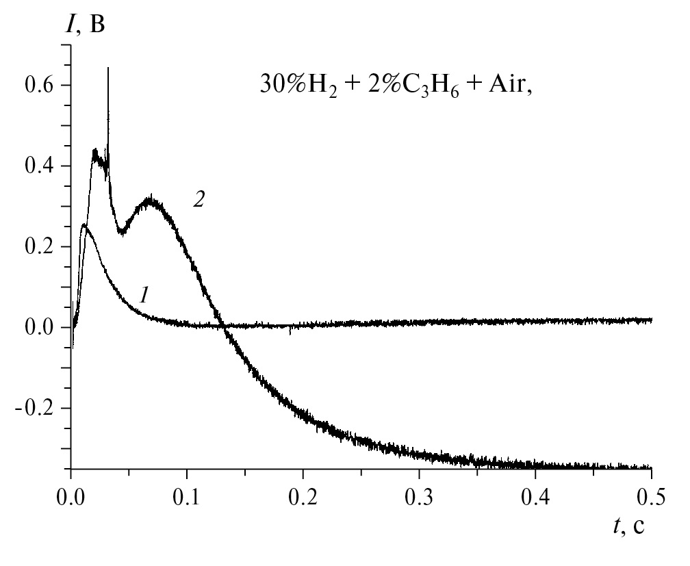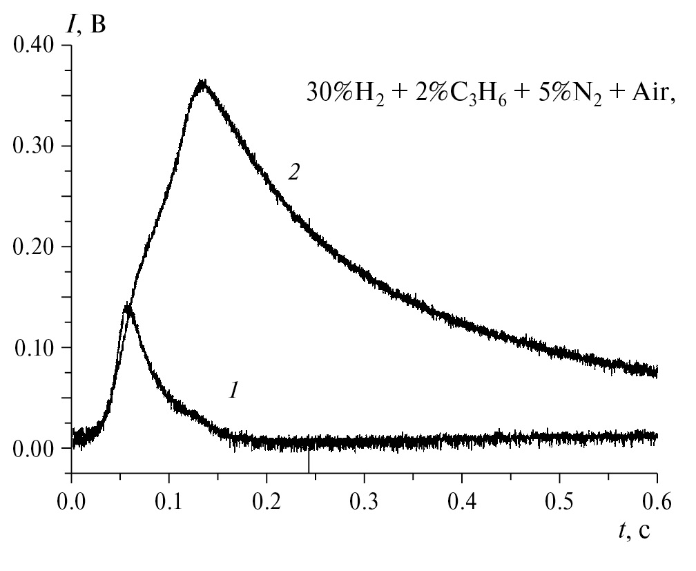 Рис. 4. Горение 30% смеси водорода в воздухе в присутствии 2%С3H6 и 5%N2 (р = 1 атм). Кривые 1 и 2 – графики хемилюминесценции и давления в зависимости от времени соответственно. В смеси 30%H2+2%C3H6+10%N2+Air горение отсутствует