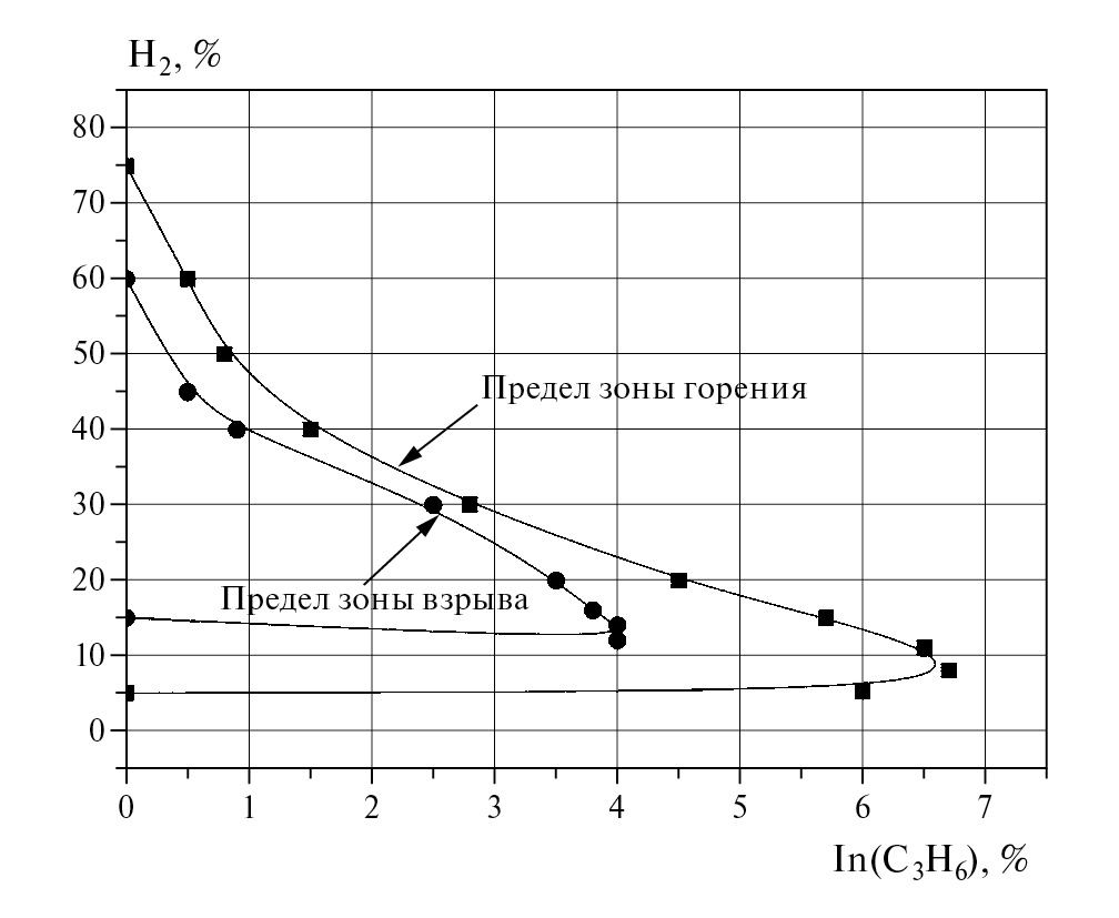 На рис. 5 представлены пределы зоны горения и взрыва для водородо-воздушной смеси. Квадратами обозначена граница зоны горения, кружками – граница зоны взрыва. Все, что находится вне зоны ограниченной кривой с квадратиками, находится вне зоны горения. Все, что находится внутри зоны, ограниченной кружками, находится в зоне взрыва. Область, ограниченная этими двумя кривыми – границами зоны горения и взрыва, находится в зоне горения.