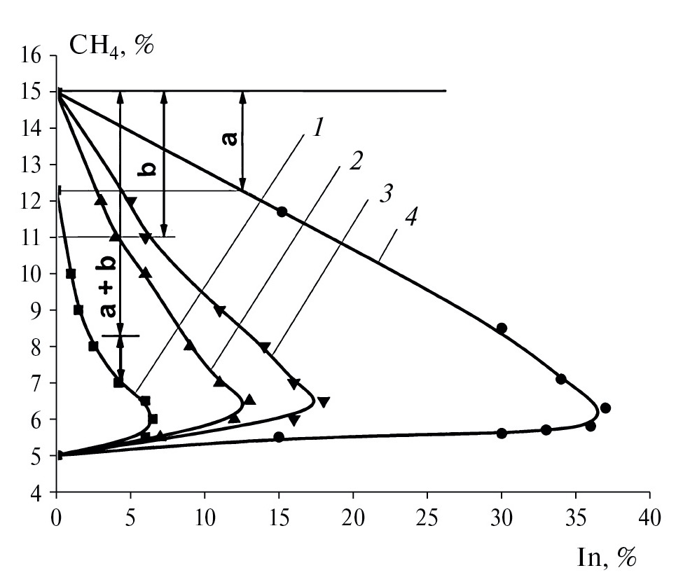 - Кривая 4 (метан с добавками N2) ограничивает зону горения, вне этой зоны горения не происходит [11].
