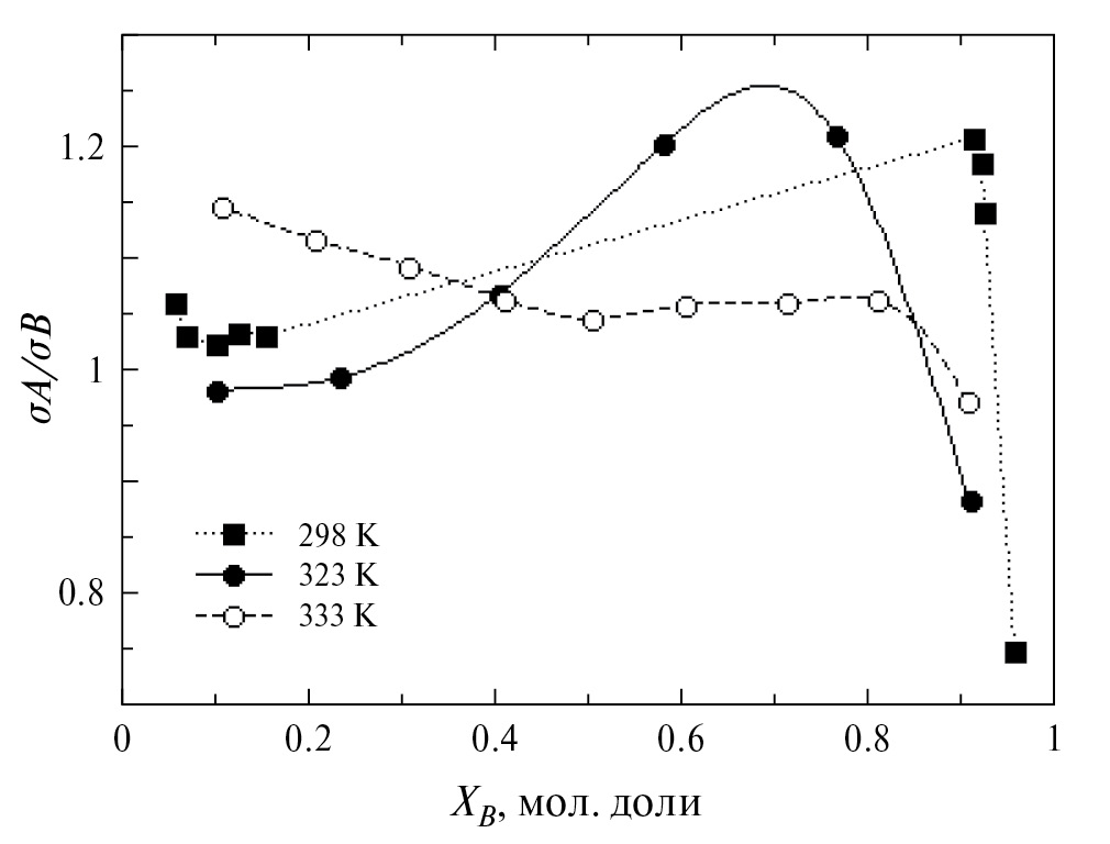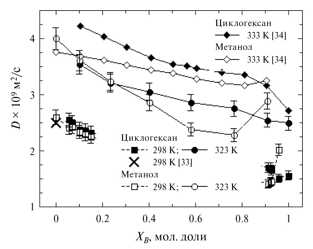На рис. 1 представлены данные по концентрационным зависимостям коэффициентов самодиффузии компонентов в бинарной системе метанол (А) – циклогексан (B). Согласно полученным данным, величина коэффициентов самодиффузии циклогексана увеличивается с ростом концентрации метанола. Вместе с тем концентрационная зависимость метанола при температуре 323 K имеет минимум в области 0.7 мольной моли циклогексана. Минимум коэффициентов самодиффузии метанола также наблюдается при температуре 298 K в области его низкой концентрации (рис. 1). Следует отметить, что в области концентраций с низким содержанием циклогексана коэффициенты самодиффузии компонентов имеют близкие значения. Полученный результат согласуется с литературными данными по коэффициенту самодиффузии циклогексана при его бесконечном разбавлении в метаноле ((2.5±0.03)×10-9 м2/с при температуре 298 K) [33] (рис. 1). Схожий характер концентрационных зависимостей коэффициентов самодиффузии (в пределах экспериментальной ошибки) представлен в работе [34] при температуре 333 K (рис. 1). Однако в данном случае наблюдается увеличение в разнице величин коэффициентов самодиффузии компонентов с ростом концентрации метанола. Как отмечено в работе [34], погрешность измерения коэффициентов самодиффузии составляла 10%. При температуре 333 K на концентрационной зависимости коэффициентов самодиффузии метанола также наблюдается минимум, но менее глубокий, чем при температуре 323 K. Наличие минимума на концентрационной зависимости коэффициентов самодиффузии метанола объясняется изменением его самоассоциации при изменении состава смеси. Таким образом, менее глубокий минимум на концентрационной зависимости коэффициентов самодиффузии метанола при температуре 333 K относительно 323 K может быть связан с его меньшей степенью самоассоциации.