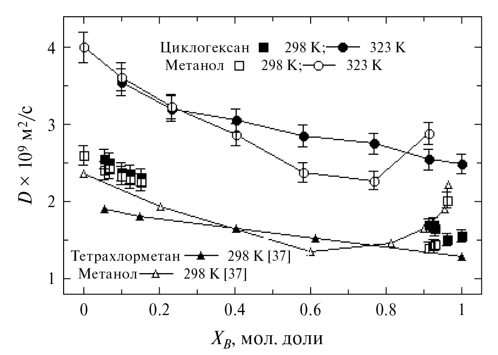 Данные по коэффициентам самодиффузии были получены по методике, использованной в работах [10–12] на спектрометре Bruker Avance III 500 с 5 мм датчиком TBI при использовании программы Bruker dstegp3s для подавления возможной конвекции в образце [1] при температуре 323 K. Температурная стабильность контролировалась блоками Bruker BVT-3000 и BCU-05 (± 0.1 K). Время диффузии составляло 0.1 с. Длительность градиентных импульсов варьировалась в зависимости от состава смеси. Для измерения коэффициентов самодиффузии при температуре 323 K образец предварительно перемешивался в воздушном термостате при температуре 333 K в течение 30 минут. Погрешность измерения коэффициентов самодиффузии не превышала 5%. Данные по коэффициентам самодиффузии в чистых растворителях при температуре 298 K (1.56×10-9 м2/с и 2.59×10-9 м2/с для циклогексана и метанола соответственно) согласуются с литературными данными [35, 36].