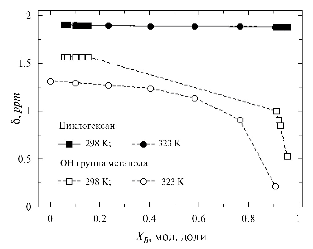 Наличие OH-групп в структуре молекулы метанола позволяет ему образовывать самоассоциаты и гетероассоциаты с сорастворителями (или растворенными веществами). Как видно из рис. 3, наблюдается значительное изменение химического сдвига протонов, , OH-группы метанола при постоянной величине химического сдвига протонов циклогексана относительно CH3-группы метанола. Уменьшение химического сдвига протонов OH-групп с ростом концентрации циклогексана и температуры указывает на увеличение доли свободных молекул метанола. Схожая концентрационная зависимость химического сдвига OH-группы метанола наблюдается в системе метанол – тетрахлорметан [42]. Постоянство химического сдвига протонов циклогексана может указывать на отсутствие участия данного компонента в процессах молекулярной ассоциации (самоассоциации и гетероассоциации) в данной системе.