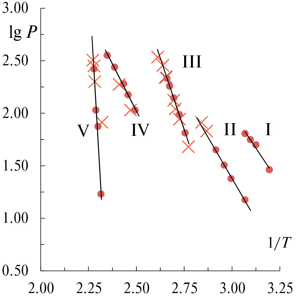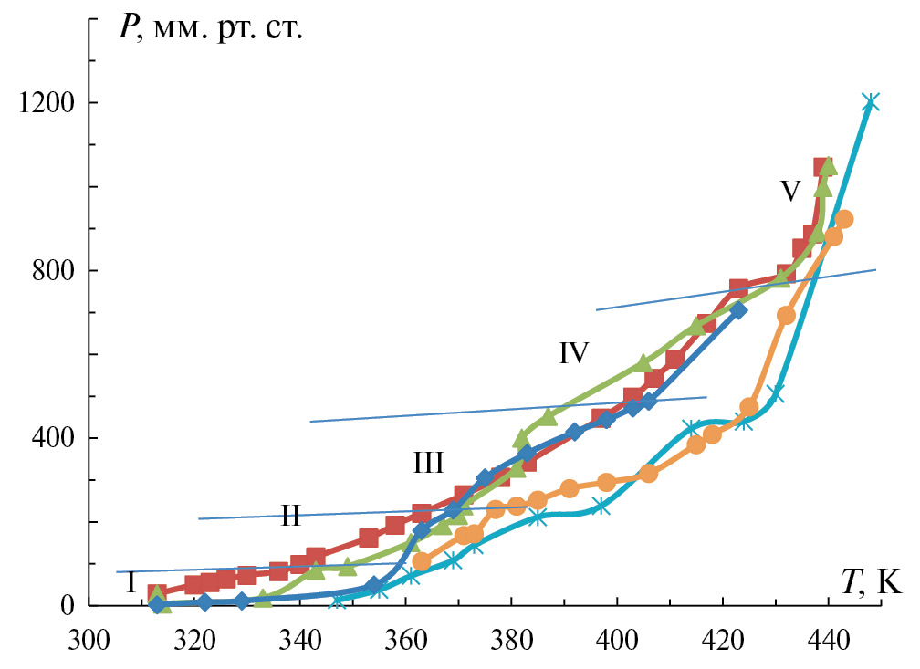 Значение давления пара отдельных степеней процесса определено путем вычитания давления предыдущих ступеней. Экспериментальные данные зависимости давления пара от температуры приведены на рис. 3.