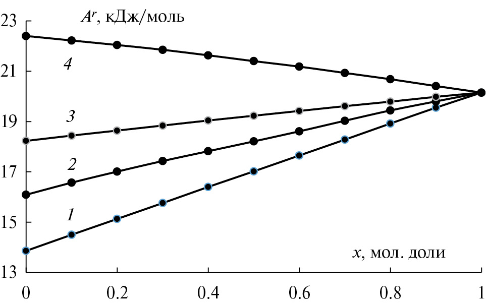 Рис. 2. Зависимости энергии Гельмгольца (Ar) от состава систем при Т = 353 К: 1– н-пропилбензол – бензол; 2 – н-пропилбензол – толуол; 3 – н-пропилбензол – н-этилбензол; 4 – н-пропилбензол – н-бутилбензол; х – мольная доля н-пропилбензола.