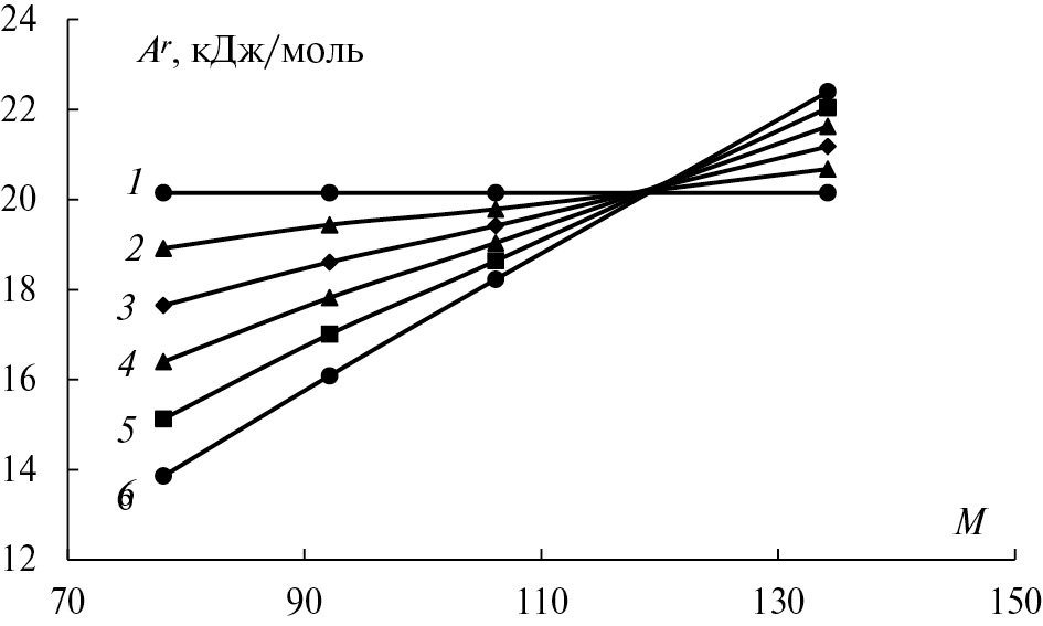 Рис. 3. Зависимости энергии Гельмгольца (Ar) от молярной массы н-алкилбензола для растворов постоянных мольных концентраций систем н-пропилбензол – н-алкилбензолы при Т = 353 К; х = 1 (1), 0.8 (2), 0.6 (3), 0.4 (4), 0.2 (5), 0 мол. долей н-пропилбензола (6).
