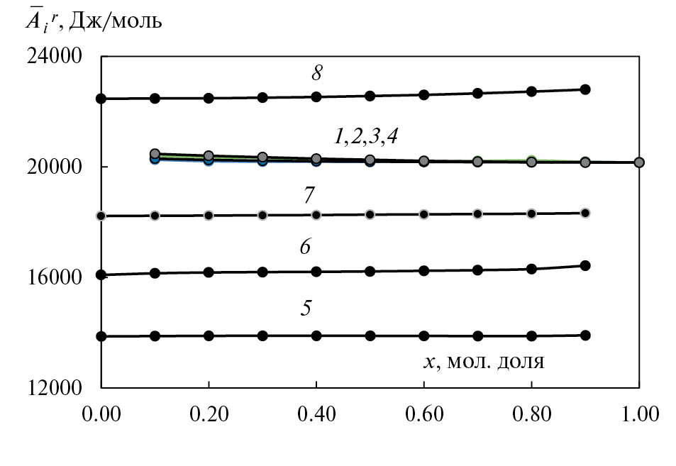 где: х – мол. доля н-пропилбензола (общий растворитель) в бинарных растворах; М – молярная масса н-алкилбензола. Уравнение (3) описывает энергию Гельмгольца (Ar) растворов систем при Т= 353 К с точностью ± 0.05 кДж/моль. Вид уравнения (3) сохраняется при других температурах и для растворов других систем. Установленная закономерность подтверждает правомерность использования гипотезы об аддитивности вкладов химических групп в термодинамические свойства растворов, лежащей в основе теории «групповых» моделей растворов [7, 15]. Отметим, что ранее уравнения вида (3) были получены для растворов бинарных систем, образованных этанолом и н-алкилэтаноатами, н-алкилпропаноатами, н-алкилбутаноатами; н-пропанолом и н-бутанолом с н-алкилэтаноатами, а также для систем, образованных н-пропанолом, н-бутанолом, изопропанолом, изобутанолом и веществами гомологического ряда алифатических кетонов, бензолом и алкилбензолами [см., например, работы [16, 17–27]. Установленная закономерность изменения энергии Гельмгольца для растворов постоянного мольного состава, вероятно, может быть вызвана «сходством молекулярно-статистической структуры растворов» [18]. Установленная закономерность позволяет прогнозировать термодинамические свойства растворов бинарных систем, используя свойства чистых компонентов и всего двух растворов одинаковой мольной концентрации. Точность прогнозирования свойств растворов зависит только от точности экспериментальных данных.