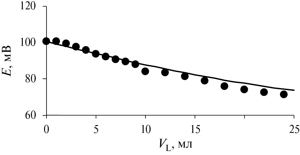 где Е0 – экспериментальное значение ЭДС в начальном растворе Cu(NO3)2 без прибавления титранта. Вычисления осуществляли для VL = 1 – 25 мл с шагом 1 мл и таким образом получали расчетную кривую титрования.