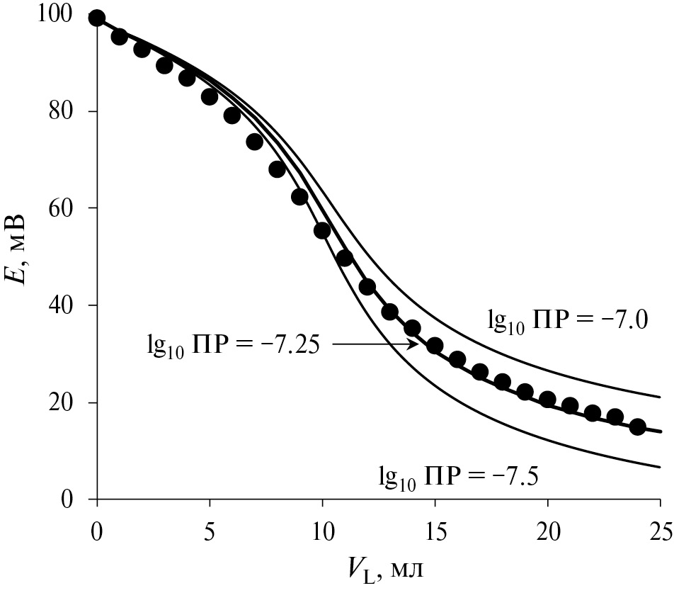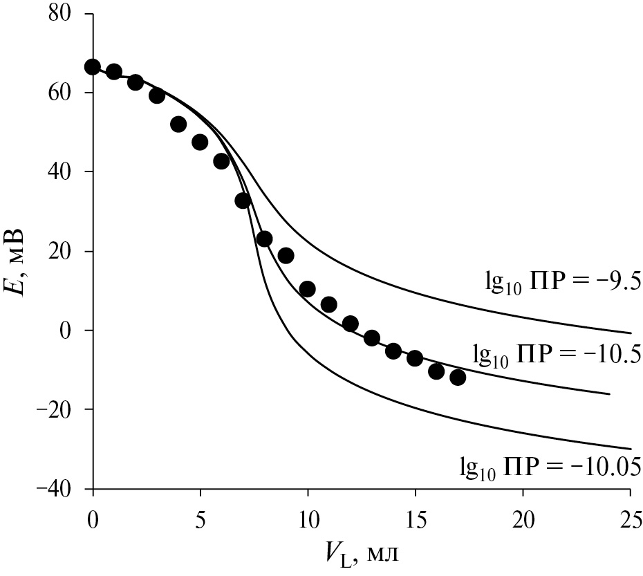Рис. 2. Пример экспериментальной и расчетных кривых титрования при различных значениях ПР в системе Cu2+ – оксалат. Условия эксперимента: 30 мл раствора 0.025 М Cu(NO3)2 + 0.1 M HNO3 титруют раствором 0.1 М щавелевой кислоты.