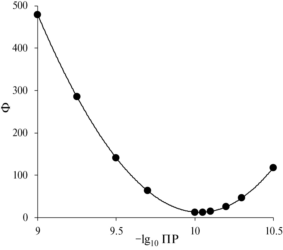 Рис. 3. Зависимость функционала расхождения расчетных и экспериментальных данных (2) от значения lg10 ПРСuC2O4 в системе Cu2+ – оксалат. Условия эксперимента те же, что указаны в подписи к рис. 2.