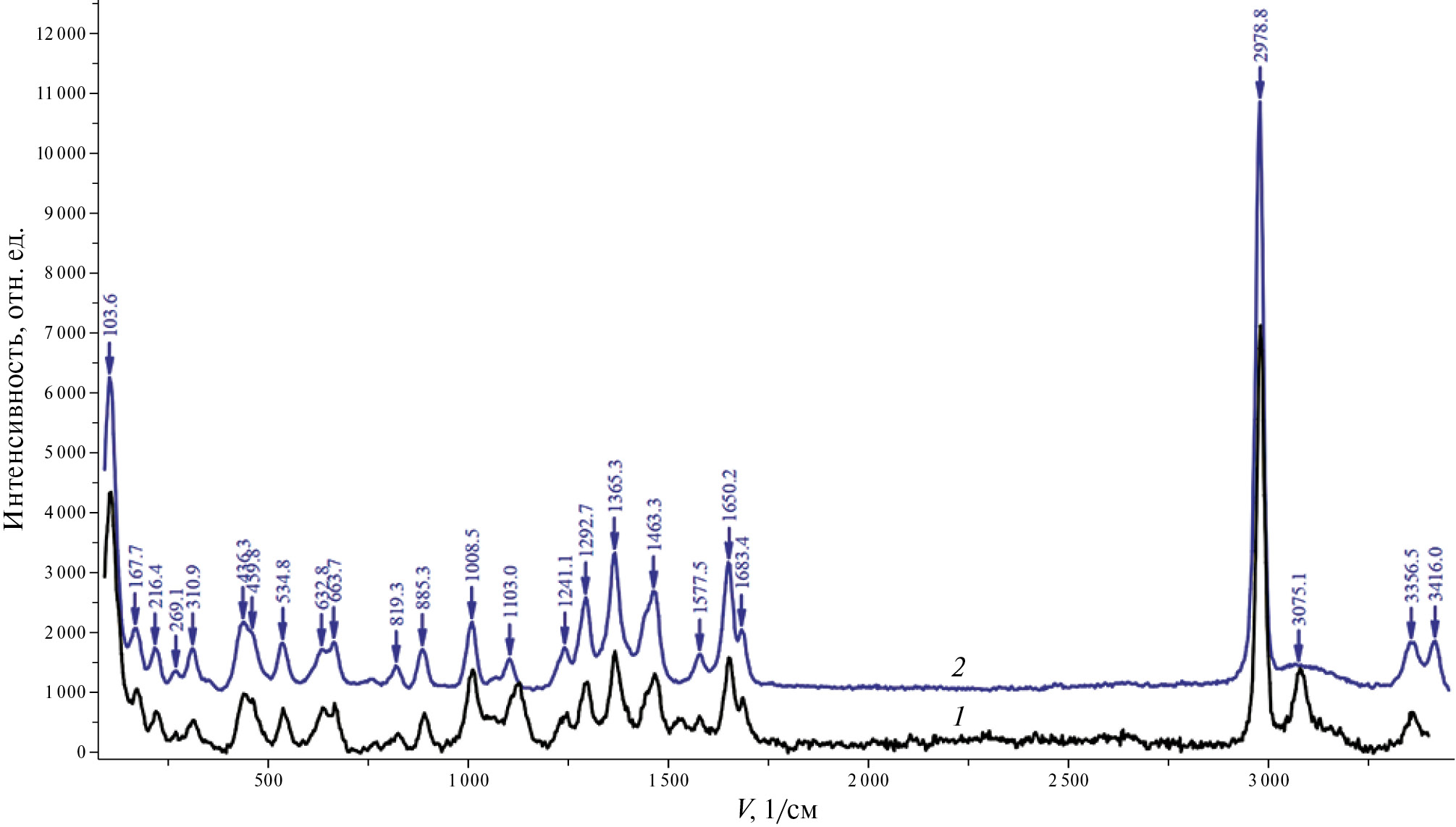 Рис. 4. Спектры комбинационного рассеяния осадков в системе Cu2+ – тартрат, полученных при взаимодействии растворов Cu(NO3)2 и тартрата калия натрия (спектр 1) или гидротартрата натрия (спектр 2); подробнее см. в тексте.