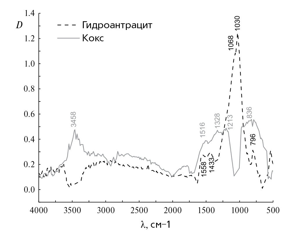 ИК-спектры углеродных материалов представлены на рис. 1. Полосы поглощения в интервале 3500–3400 см–1 связаны с валентными колебаниями ОН-групп, которые определяют содержание влаги в образце. Пик при 796 см–1 относится к деформационным колебаниям С-Н. Широкий пик при 1400–1160 см–1 отвечает за серосодержащие соединения и деформационные колебания С-Н группы. Широкая сильная полоса при 1030 см–1 для гидроантрацита отвечает колебаниям С-О-С в сложных эфирах. Гидроантрацит, в отличие от активированного кокса, имеет на поверхности кислородные функциональные группы, которые играют важную роль в сорбции полярных веществ [1].