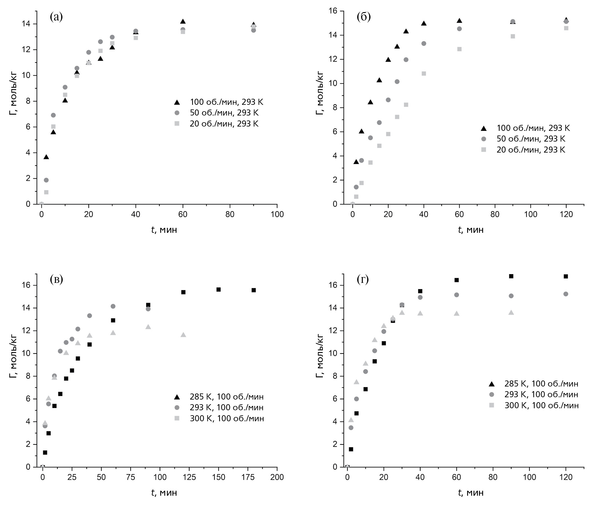 Рис. 2. Изотермы сорбции этилового спирта на активированном нефтяном коксе при разной скорости перемешивания (а) и температуре (в) и на гидроантраците при разной скорости перемешивания (б) и температуре (г).