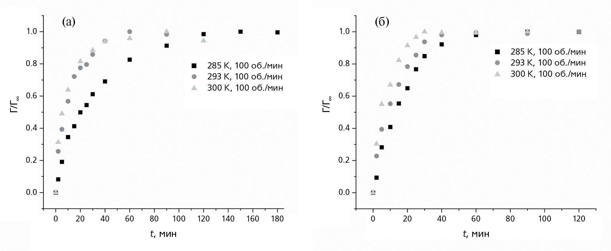 Увеличение температуры сорбции увеличивает скорость процесса, состояние, близкое к равновесию, устанавливается за меньшее время (рис. 3). Для гидроантрацита скорость процесса монотонно возрастает с увеличением температуры с 285 до 300 К. Однако для активированного нефтяного кокса температурная зависимость наблюдается только при переходе с 285 до 293 К, а затем влияние температуры на скорость процесса становится незначительным. Это может быть связано с развитием обратного процесса – десорбции – при увеличении температуры более 293 К.