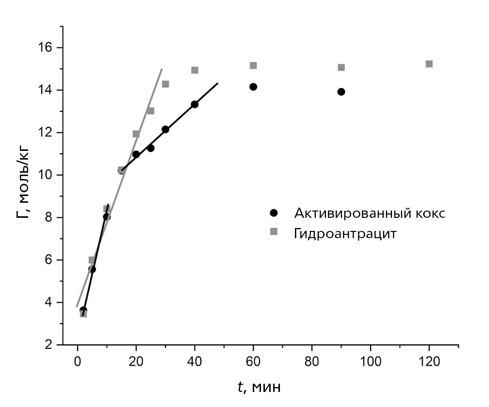 Первые 15 мин процесса кривые сорбции для двух углеродных материалов близки, однако затем наблюдается более высокая скорость сорбции для гидроантрацита. Это может быть связано с изменением лимитирующей стадии процесса для активированного нефтяного кокса, что подтверждается изменением угла наклона сорбционной кривой после 15 мин. Предельные величины сорбции для углеродных материалов близки и равны 15.2±0.4 и 14.2±0.4 моль/кг для гидроантрацита и активированного нефтяного кокса соответственно. Высокое значение сорбции для активированного кокса объясняется большой площадью поверхности, где может происходить процесс сорбции, для гидроантрацита основной вклад вносит наличие поверхностных кислородных функциональных групп. Однако из-за более быстрой кинетики для гидроантрацита его применение для сорбции спирта может быть более предпочтительно.