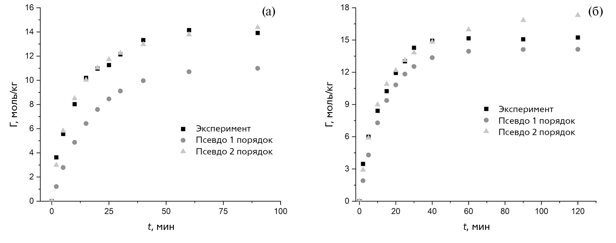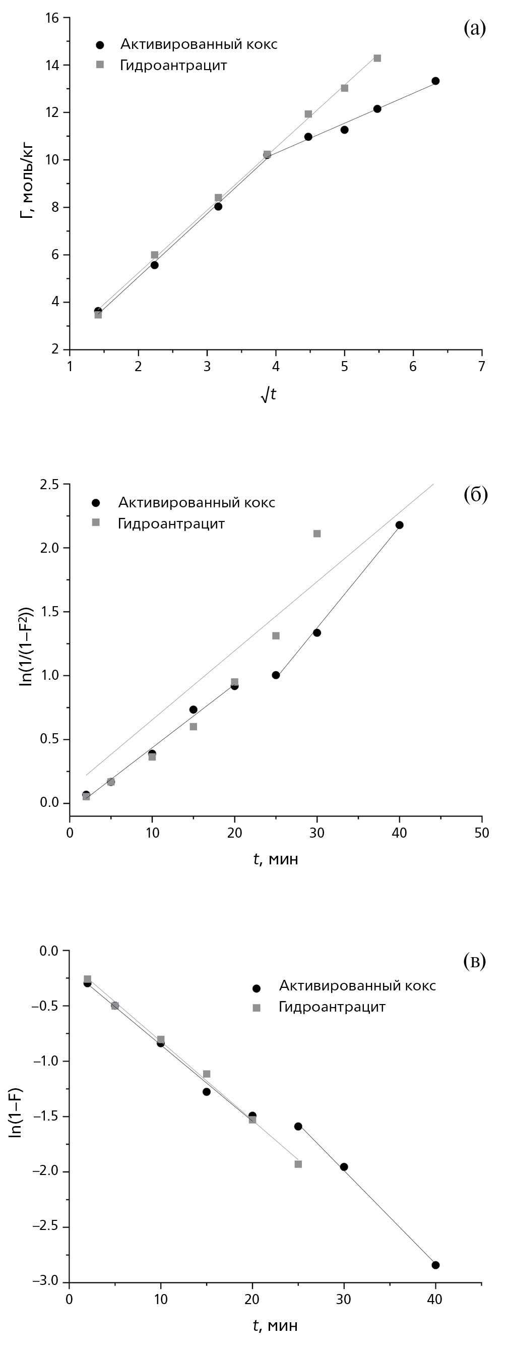 Из рис. 6а хорошо видно, что для активированного кокса модель псевдо-первого порядка действительно плохо описывает экспериментальные данные. Для гидроантрацита предпочтение стоит отдать модели псевдо-первого порядка, так как она более сопоставима с данными эксперимента при времени сорбции более 60 мин [39]. Модель псевдо-первого порядка выходит на равновесное состояние после 60 мин, как и экспериментальная изотерма сорбции, однако модель псевдо-второго порядка не достигает равновесных значений даже при времени сорбции 120 мин.