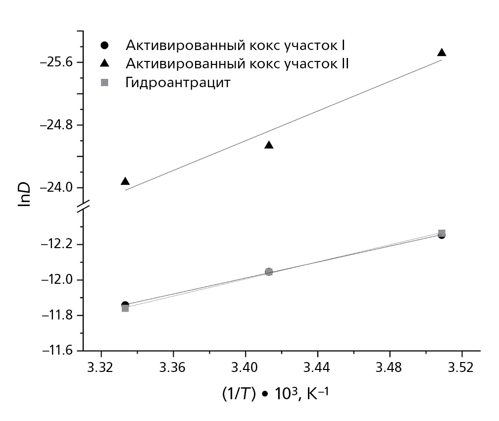 Гидроантрацит | 285 | 4.72×10‒6 | lnD = ‒2.41/T – 3.81 | 0.999 | 20.03±5.31 |