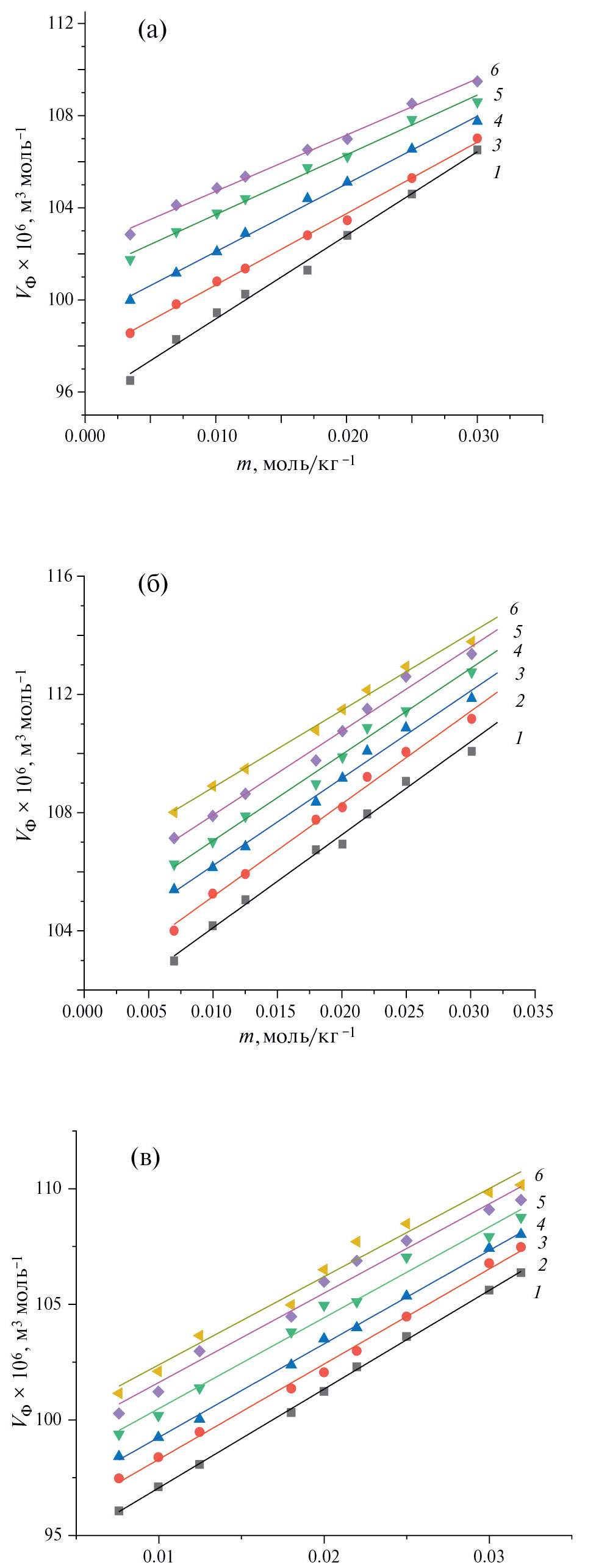 На основе результатов исследований объемных свойств водных растворов веществ различной химической природы [29–36] установлено, что для описания концентрационных зависимостей кажущихся молярных объемов Vφ в разбавленных водных растворах электролитов преимущественно используют уравнение Редлиха – Майера [37], а в разбавленных водных растворах неэлектролитов (аминокислот, аскорбиновой кислоты, глюкозы, фруктозы, производных мочевины и др.), в основном, применяют уравнение Мэзона [38], которое носит линейный характер. В настоящей работе показано (рис. 2), что линейность зависимости Vφ от m сохраняется для изомеров PA, NA и INA в водном буферном растворе в изученном интервале концентраций и при каждой температуре: