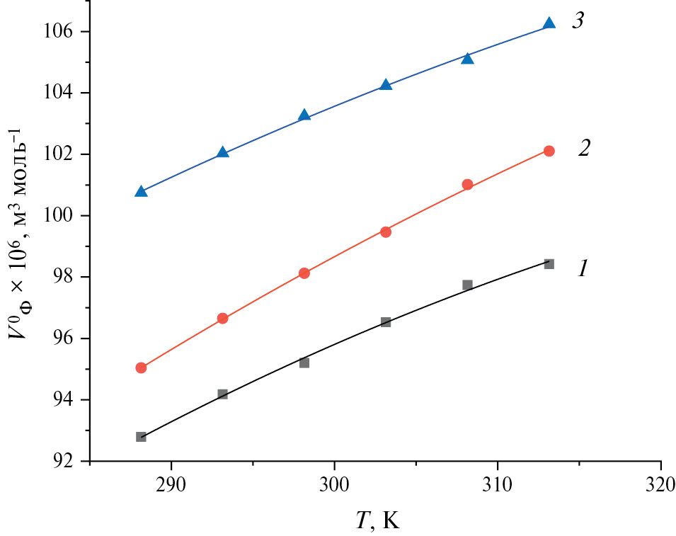 Для описания эффектов температуры на парциальные молярные объемы при бесконечном разбавлении Voφ использовано уравнение полинома второй степени: