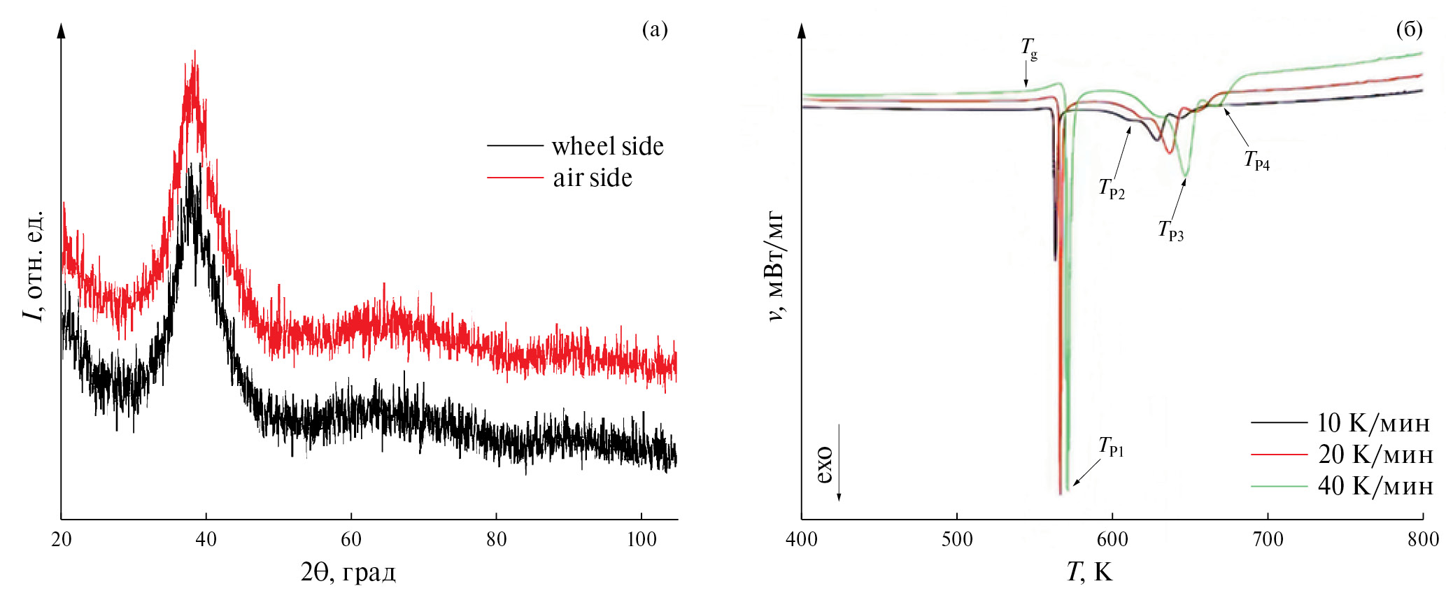 На рис. 1 приведен типичный вид дифрактограмм (а) и термограмм ДСК (б), полученных для быстрозакаленных лент Al–Ni–Co–РЗМ, на примере сплава Al86Ni4Co4Tb6.