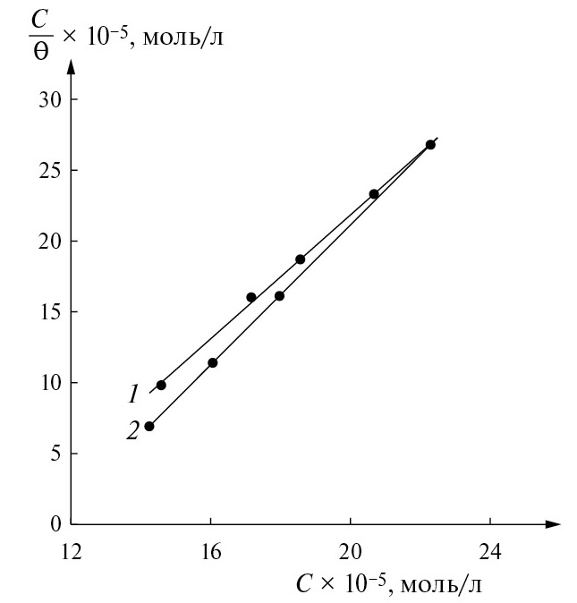 Согласно литературным данным, при высоких значениях θ адсорбционное поведение ингибитора может быть описано изотермой Ленгмюра, которая выражается следующим уравнением [1, 5, 8]: