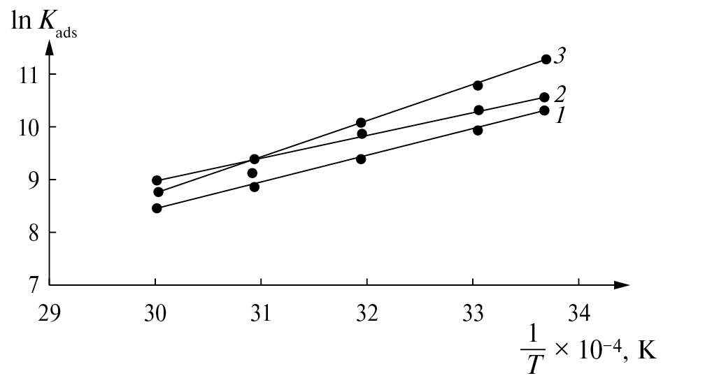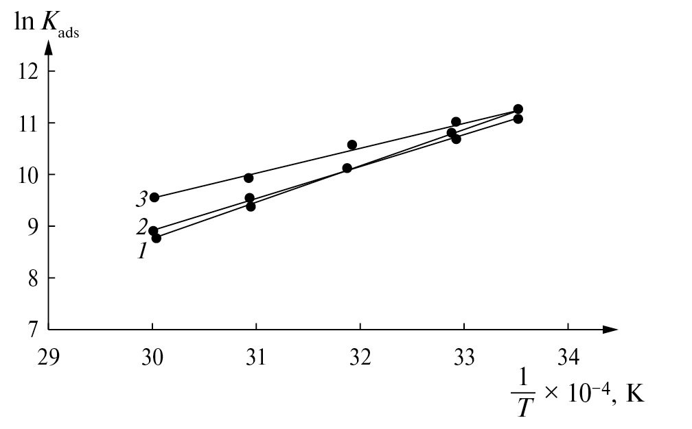 Вычисленные значения констант равновесия (Кaдc) и термодинамические показатели процесса адсорбции (∆Gадс,∆Hадс,∆Sадс) приведены в табл. 3 и 4.