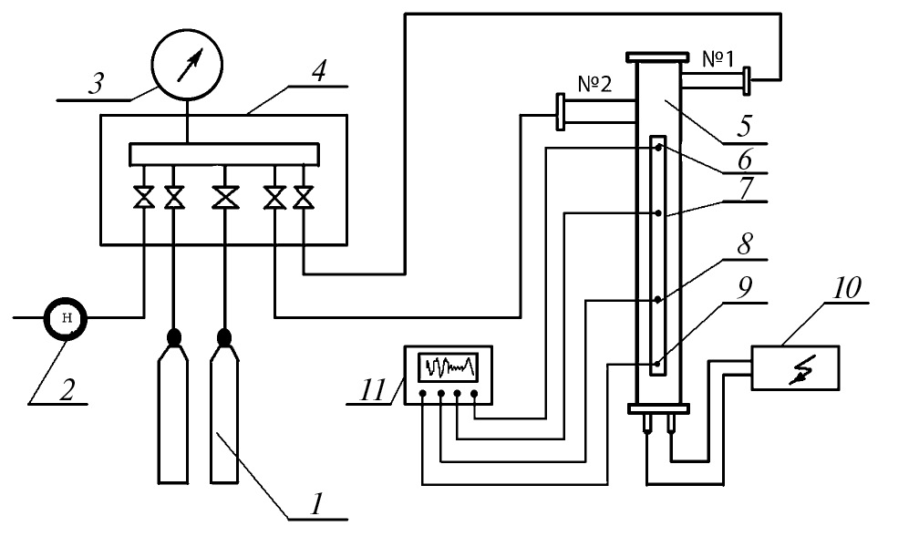 Рис. 1. Стенд с вертикальной реакционной трубой: 1 – баллоны с газами, 2 – вентиль напуска газа на установку, 3 – манометр, 4 – гребенка с кранами, 5 – реактор, 6–9 – фотодатчики, 10 – блок зажигания, 11 – осциллограф.