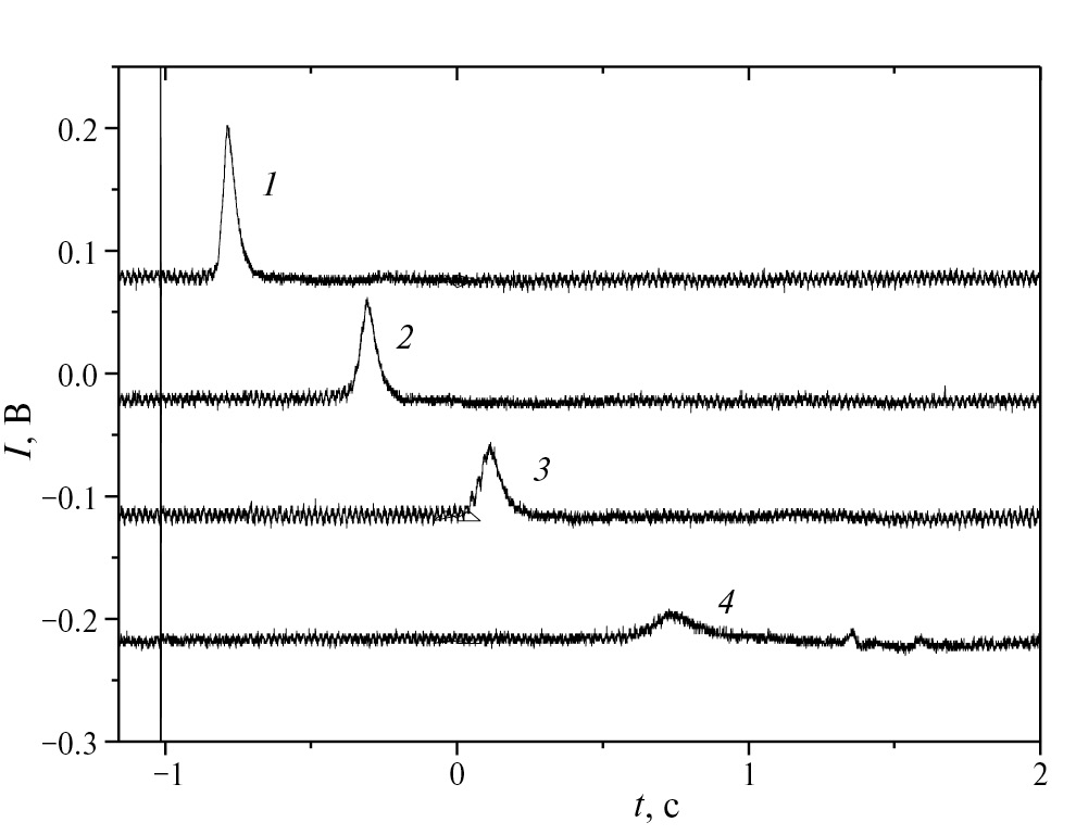 На рис. 2 в качестве примера представлены осциллограммы фронта пламени, пробегающего мимо датчиков при горении 6% метана в воздухе в отсутствие угольной пыли и ингибиторов. После зажигания исследуемой смеси в нижней части реактора пламя регистрируется в зоне первого датчика. Рисунок показывает, что к моменту прихода зоны горения ко второму датчику в зоне первого датчика пламени уже нет, поскольку у первого датчика горение уже завершилось. После второго датчика пламя регистрируется третьим, а затем четвертым датчиками. Обратим внимание, что последовательная регистрация движения пламени вдоль реактора демонстрирует послойный характер распространения пламени в хорошем согласии с теорией горения [1–3]. При увеличении содержания метана в исходной смеси скорость пламени возрастает и в области 8% содержания метана в воздухе проходит через максимум. При открытом выходном торце реактора (рис. 3) скорость пламени больше и наблюдается прогрессирующий характер ускорения.