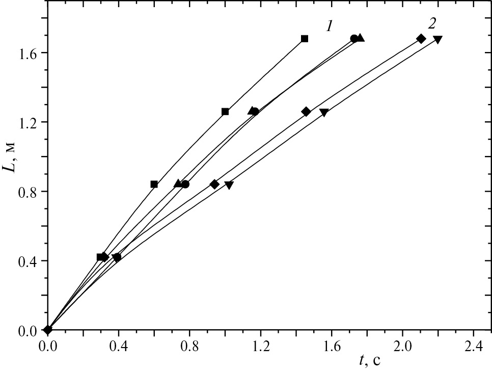Рис. 3. х – t-диаграмма горения метано-воздушной смеси c 10% СH4 в воздушной среде c открытым (1) и закрытым (2) торцами.
