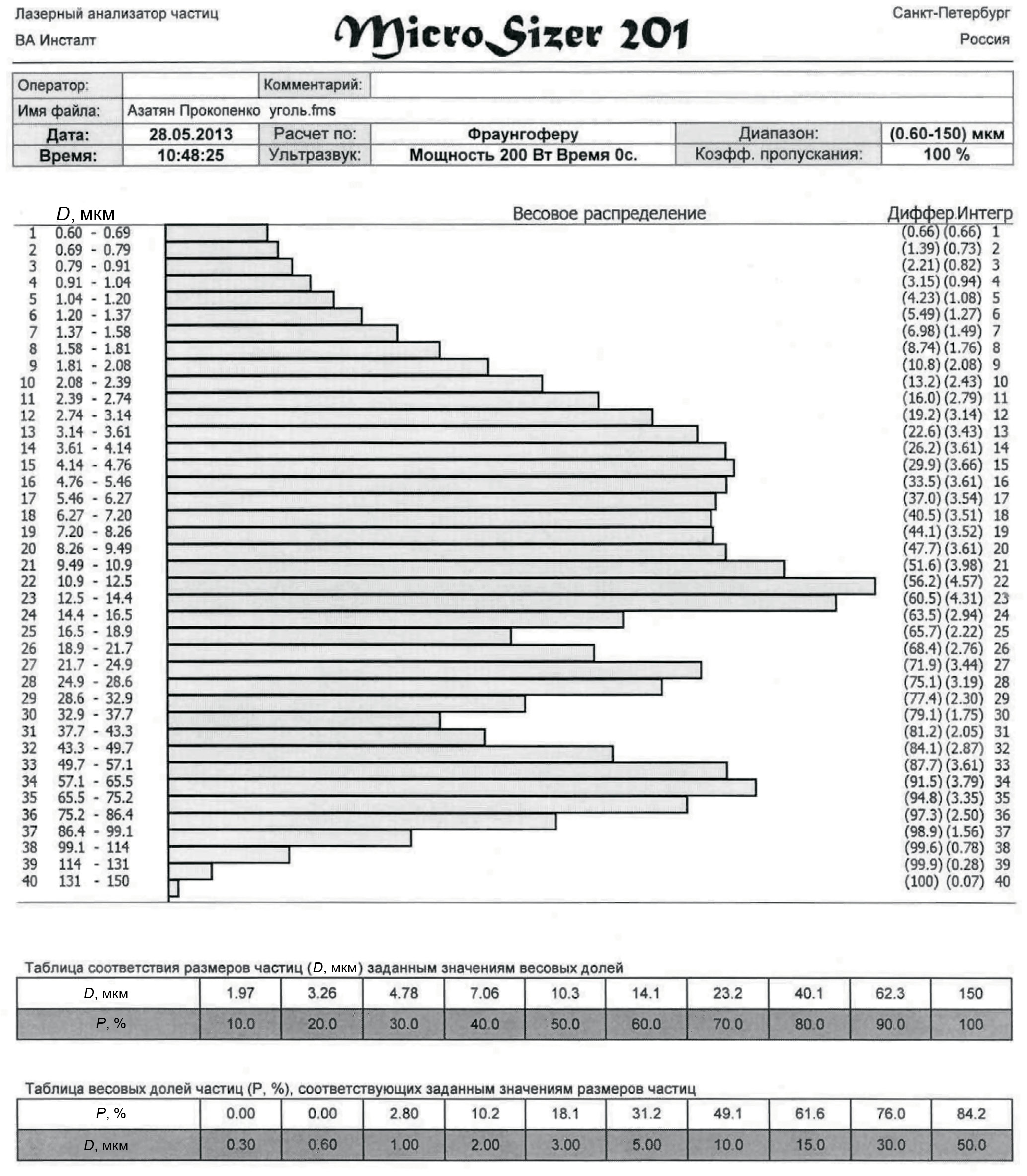 Влияние угольной пыли и ингибитора. Использовались угольные пыли следующих марок: КЖ (коксовый жирный), антрацит и графит. На рис. 4 представлена гистограмма порошка антрацита, снятая на лазерном анализаторе частиц «ВА Инсталт». Размер частиц находится в основном в интервале 6–20 мкм.