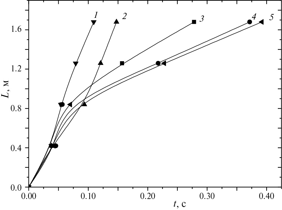 Рис. 5. х – t-диаграмма горения метано-воздушной смеси c 5.5% СH4 + 94.5% воздух; кривые 1, 2 – 5.5% CH4 + 94.5% воздух + уголь, кривые 3, 4, 5 – без угля.