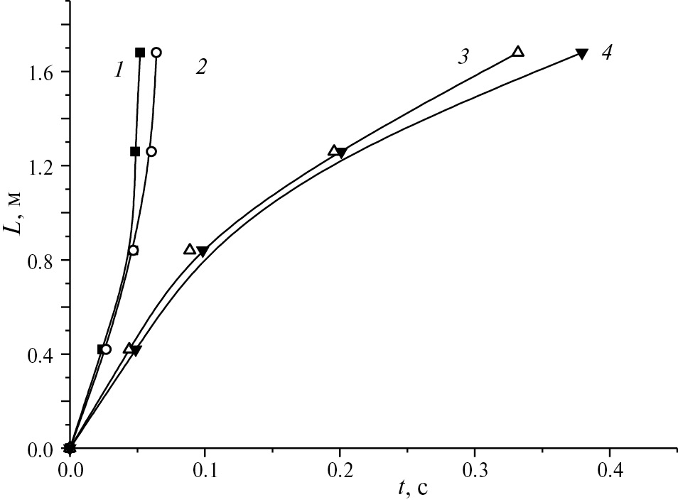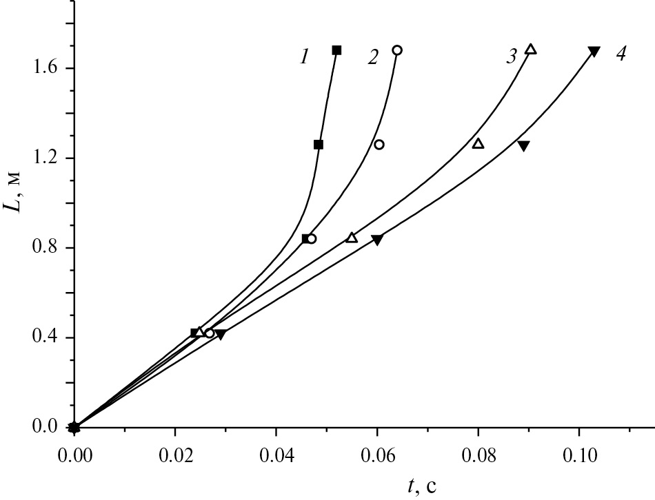 Рис. 7. х – t-диаграммы распространения пламени в метано-воздушных смесях с угольной пылью (9% метана (1, 2) и 11% метана (3, 4)).