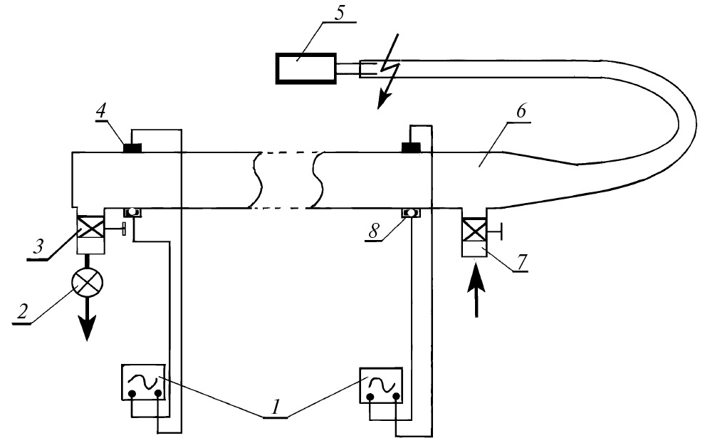 Рис. 9. Стенд с ударной трубой: 1 – осциллографы, 2 – насос, 3 – вентиль, 4 – фотодатчики, 5 – реактор, 6 – источник искрового инициирования, 7 – выходной вентиль, 8 – датчик давления.