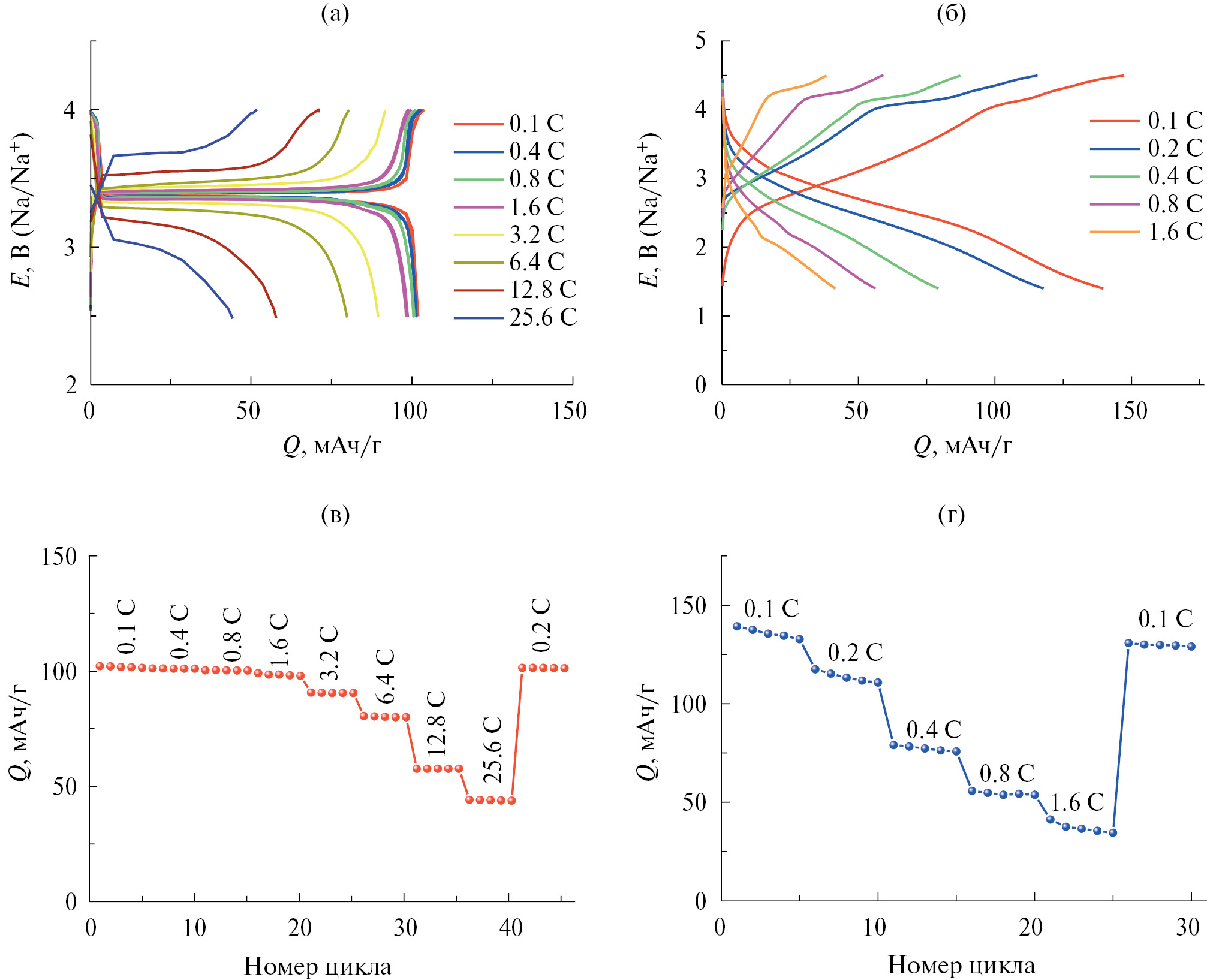 При тестировании макетов натрий-ионных аккумуляторов первые два формировочных цикла проводили в следующем режиме: заряд при постоянном токе 0.1 С до напряжения 4.1 В, далее следовал заряд при постоянном напряжении до спада тока до 0.05 С, разряд при постоянном токе 0.1 С до напряжения 0.4 В. Последующие циклы проводили в таком же режиме при токах 2, 0.4, 1 и 2 С. Ток, равный 2 мА, соответствовал режиму 1 С.