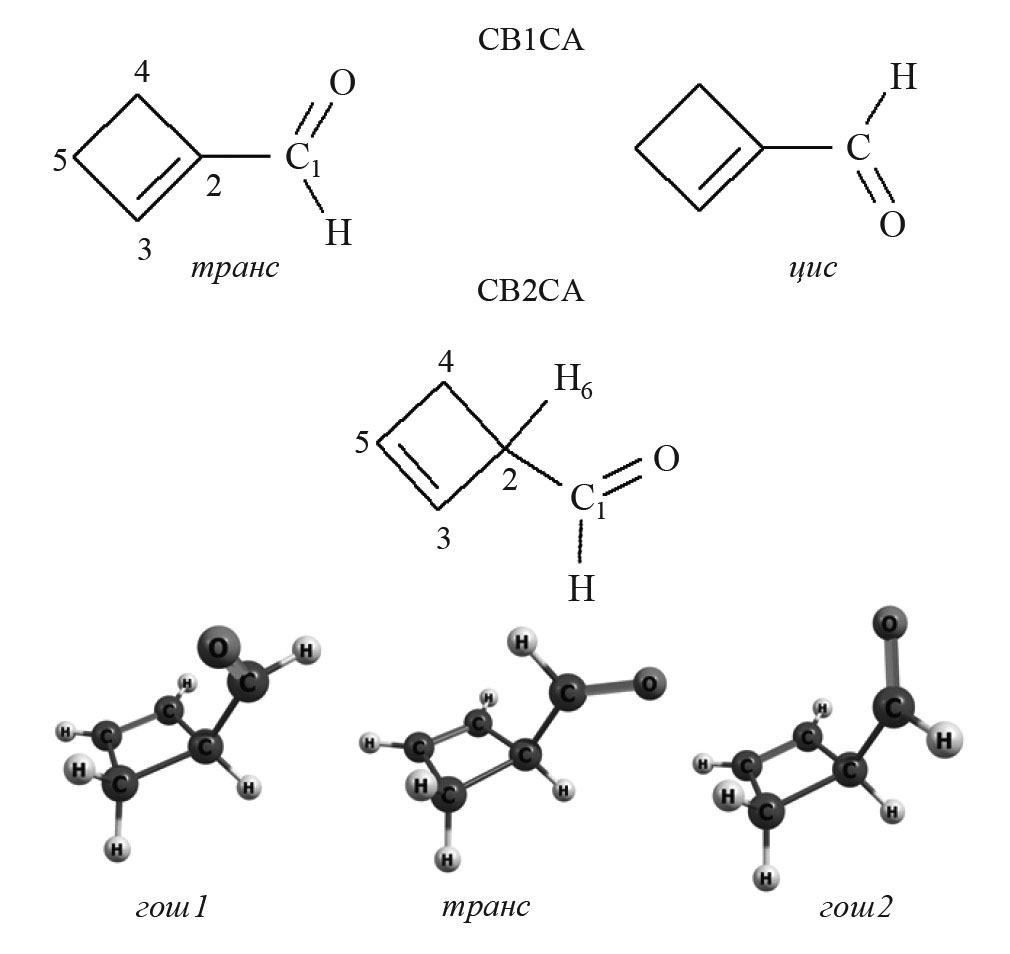 Объектами исследования выбраны молекулы циклобутен-1-карбальдегида (cyclobut-1-ene-1-carbaldehyde, CB1CA) и циклобутен-2-карбальдегида (cyclobut-2-ene-1-carbaldehyde, CB2CA) (см. рис. 1). Какие-либо данные о строении и колебательных спектрах этих молекул в литературе отсутствуют, лишь в нескольких статьях обсуждаются особенности раскрытия цикла в CB2CA [6, 7].