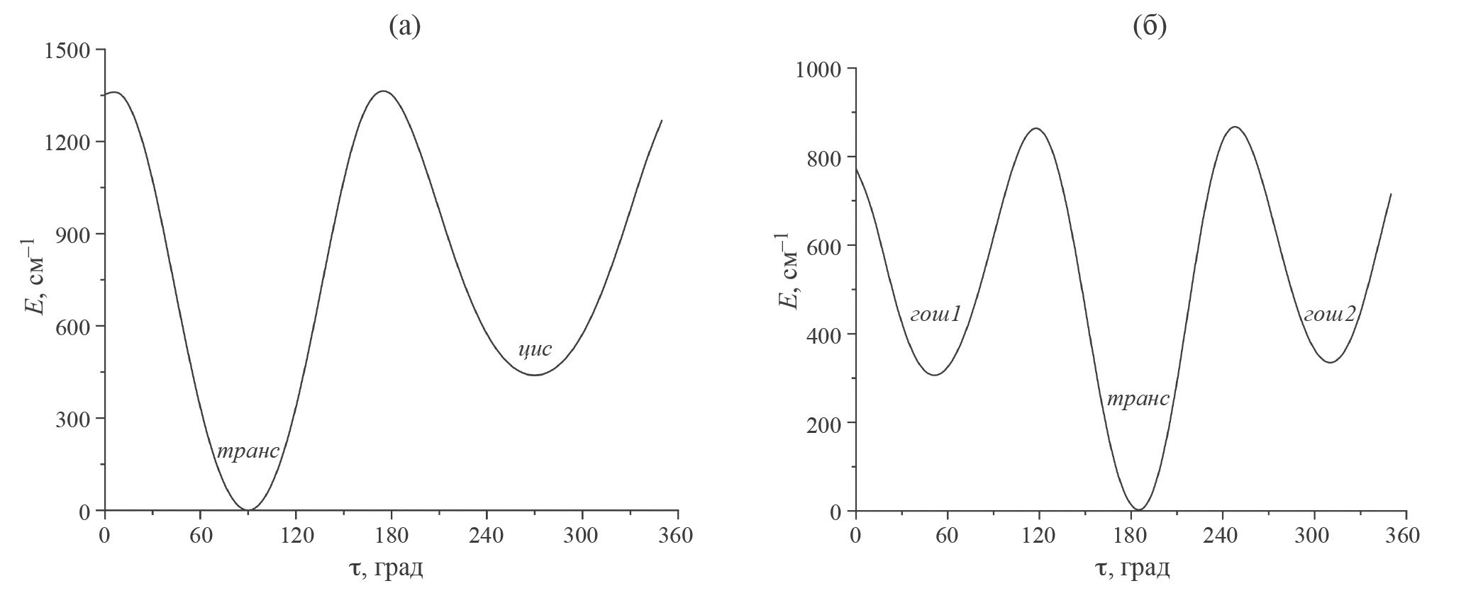 Обратим внимание на транс-конформер, в котором наблюдается максимальное различие в энергиях – 30 см–1. При этом гармоническое приближение (85 см–1) и 2D (82 cм–1) дают близкие результаты, но сильно отличающиеся от 1D расчета (112 см–1). Наш анализ показывает, что это результат сложного характера колебания, обусловленного особенностями оператора кинетической энергии.