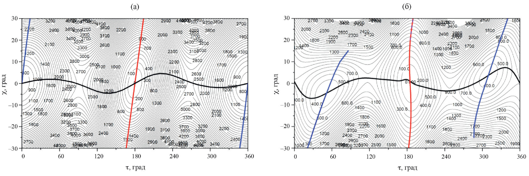 Для оценки необходимости учета сложного характера движения мы рассмотрели 1D- и 2D-ангармонические модели. Для этого были построены сечения ППЭ по координатам внутреннего вращения и деформационного колебания CHO-группы. Координатами внутреннего вращения были выбраны для CB1CA τ = ∠OC1C2C3 и χ угол поворота формильной группы относительно оси XC2 (где X – фиктивный атом, лежащий в плоскости C3C2C4 так, что прямая XC2 перпендикулярна связи C1C2). Для молекулы CB2CA координатами выступали τ = ∠OC1C2C6 и c – угол поворота формильной группы относительно оси XC2 (здесь X – фиктивный атом, лежащий на прямой, проходящей через атом С2 и перпендикулярной плоскости C3C2C4). Карты 2D сечений ППЭ приведены на рис. 3.
