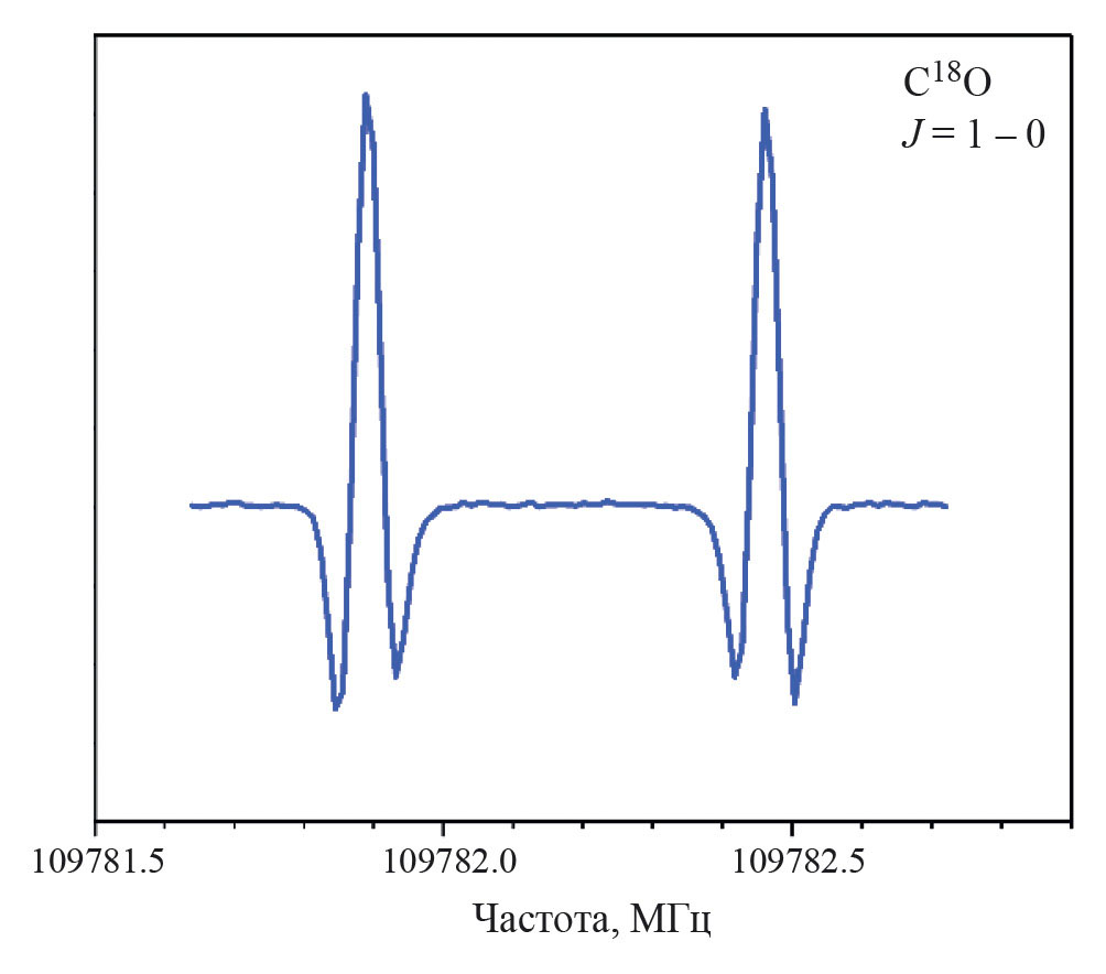 Чувствительность и разрешающая способность представленного выше спектрометра были проверены путем измерения вращательных переходов J = 1–0 (J – квантовое число вращательного углового момента) редких изотопологов монооксида углерода (СО) с естественным содержанием. Ввиду большой значимости СО как вторичного стандарта, охватывающего диапазон миллиметровых волн вплоть до дальнего инфракрасного диапазона, а также в астрофизических наблюдениях, имеется достаточно большой объем высокоточных спектроскопических данных об этой молекуле и ее изотопологах. Переходы с низкими значениями J изотопологов 12C18O, 13C16O и 13C18O наблюдались с помощью метода спектроскопии насыщения поглощения (провалы Лэмба) с точностью 1 кГц или даже лучше [17–20]. Помимо тестирования нашего спектрометра, представленные здесь результаты дают наиболее точное значение частоты самого нижнего вращательного перехода 13C18O, включая его впервые разрешенную сверхтонкую структуру, обусловленную спином ядра 13C.