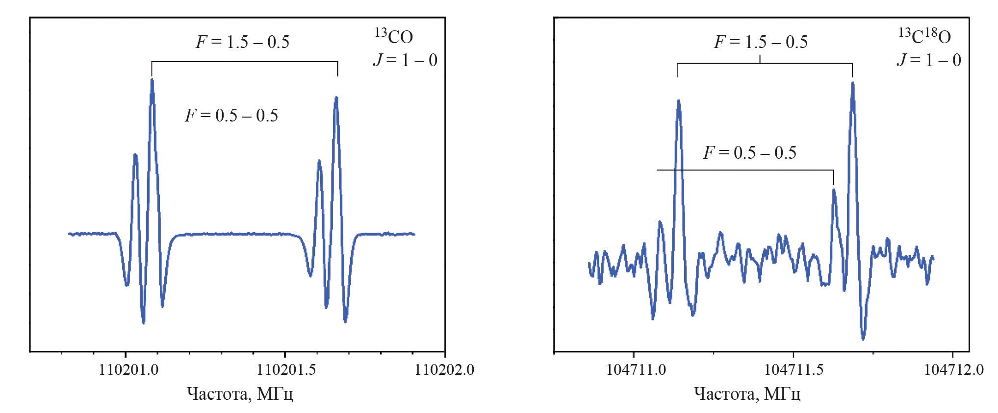 Рис. 3. Вращательные переходы J = 1–0 изотопологов 13C16O (слева) и 13C18O (справа). Большее расщепление обусловлено доплеровским сдвигом, а меньшее – спин-вращательным взаимодействием ядра 13C