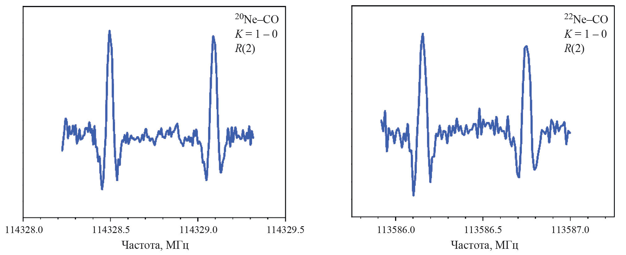 Возможности нового спектрометра для изучения ван-дер-ваальсовых комплексов демонстрируются на примере комплекса Ne–CO и его изотополога с 22Ne. Этот комплекс является одним из наиболее слабосвязанных с энергией глобального минимума –49.41 см–1 и энергией диссоциации 31.45 см–1 [21]. Спектры вращательных переходов J = 3–2, K = 1–0 (K – проекция вращательного углового момента J на межмолекулярную ось) комплексов 20Ne–CO (естественное содержание 90.92%) и 22Ne–CO (естественное содержание 8.82%) показаны на рис. 4. Использовалась газовая смесь 3% CO в Ne при давлении 4–5 бар. Наблюдаемые частоты переходов согласуются с предыдущими измерениями, полученными на высокочувствительном внутрирезонаторном спектрометре на базе оротрона [22], но сейчас они определены с точностью 3–4 кГц по сравнению с 30 кГц в более раннем исследовании.