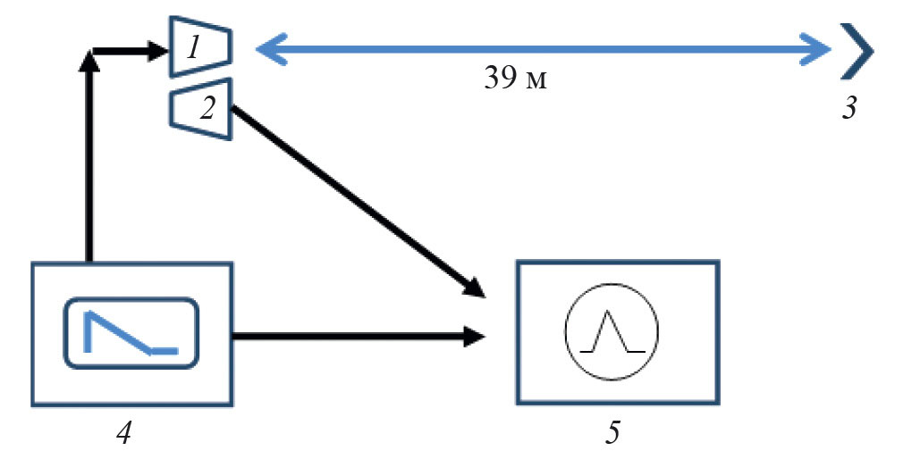 Рис. 2. Схема проведения эксперимента; 1 – диодный лазер, 2 – фотоприемник, 3 – призма «кошачий глаз», 4 – генератор импульсов, 5 – осциллограф