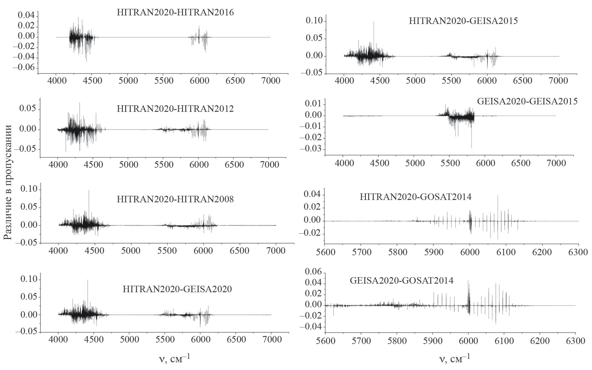 Моделирование атмосферного пропускания производилось методом полинейного счета line-by-line [21] с использованием контура Фойгта со спектральным разрешением 0.02 см–1. В качестве метеомодели применялась модель лета средних широт [22] с содержанием метана 1.8 ppm. Атмосфера разбивалась на 45 слоев от 0 до 100 км с постоянными значениями температуры, давления и концентрации газов. Разница в пропускании, вычисленном с линиями поглощения СН4 из различных баз данных, приведена на рис. 1. Банк линий метана GOSAT2014 содержит параметры линий только в области тетрадекады 5550–6240 см–1, поэтому сравнение с ним было сделано только в этом диапазоне. Имеются большие различия (более 0.1 в пропускании) между результатами моделирования с различными банками данных, в частности даже между двумя новыми версиями HITRAN2020 и GEISA2020.
