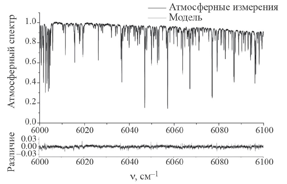 Для определения содержания СН4 в атмосфере использовался спектральный диапазон 6000–6100 см–1. В этом диапазоне основными мешающими атмосферными газами являются Н2О и СО2. Содержание этих газов одновременно определялось в других интервалах ближнего ИК-диапазона и корректировалось в прямой задаче.