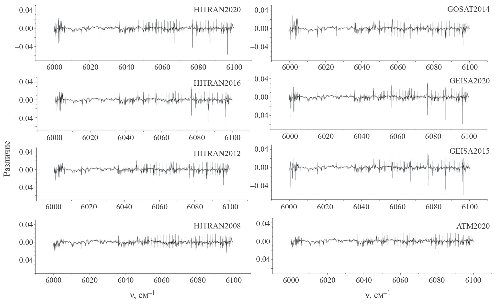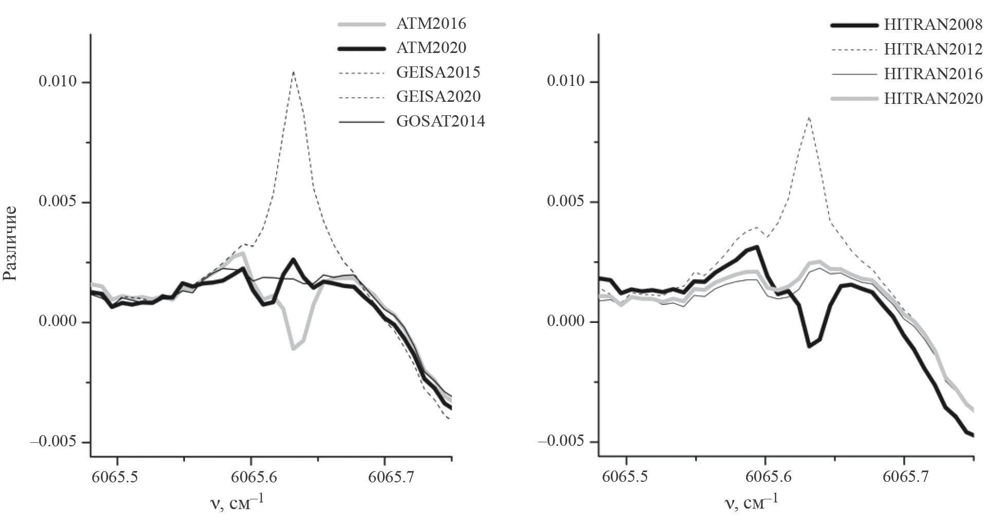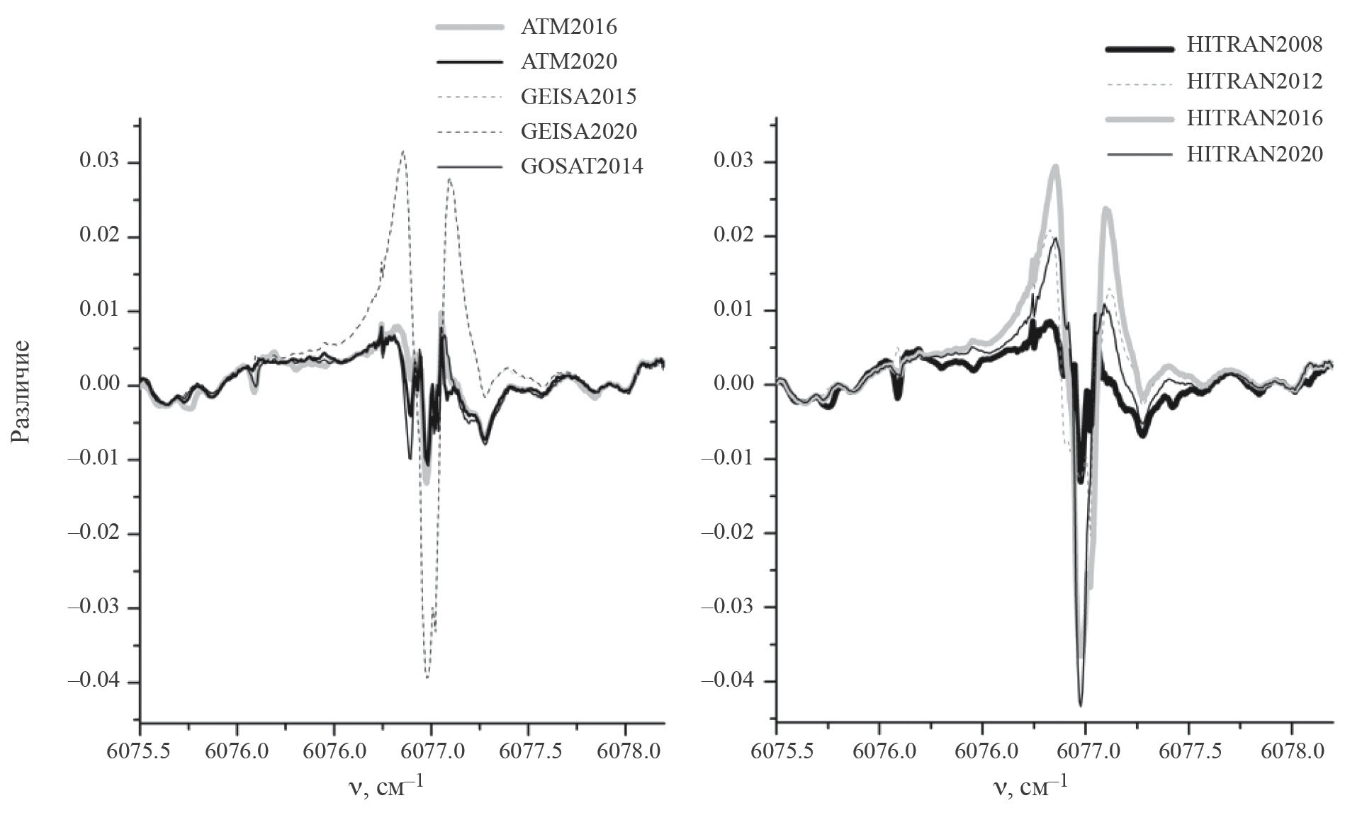 Некорректные параметры линий поглощения приводят к характерной форме разницы между измеренным и вычисленным спектрами, и по этой форме можно определить, какие параметры вносят наибольший вклад в погрешность. На рис. 4 приведен пример некорректных значений полуширины линий CH4 в коэффициентах уширения воздухом в GEISA2020, 2015 и HITRAN2012, 2016. Как видно из табл. 1, для линии основного изотополога метана с центром 6076.95 см–1 коэффициенты полуширины в случае уширения воздухом γair в выше перечисленных БД значимо отличаются от величин в других БД.