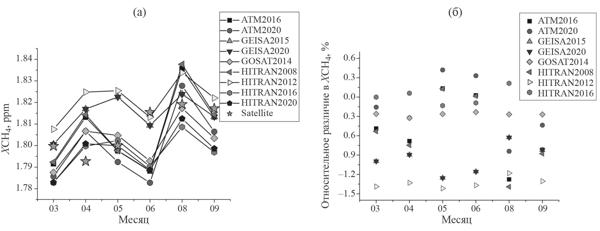 На рис. 6б приведено относительное отличие результатов определения содержания СН4, полученных с использованием линий поглощения СН4 из HITRAN2020, от результатов с другими БД. Различия в среднемесячном содержании метана за счет использования разных спектроскопических БД по линиям поглощения СН4 достигают 1.5%, а в отдельных измерениях могут достигать 4% и более.