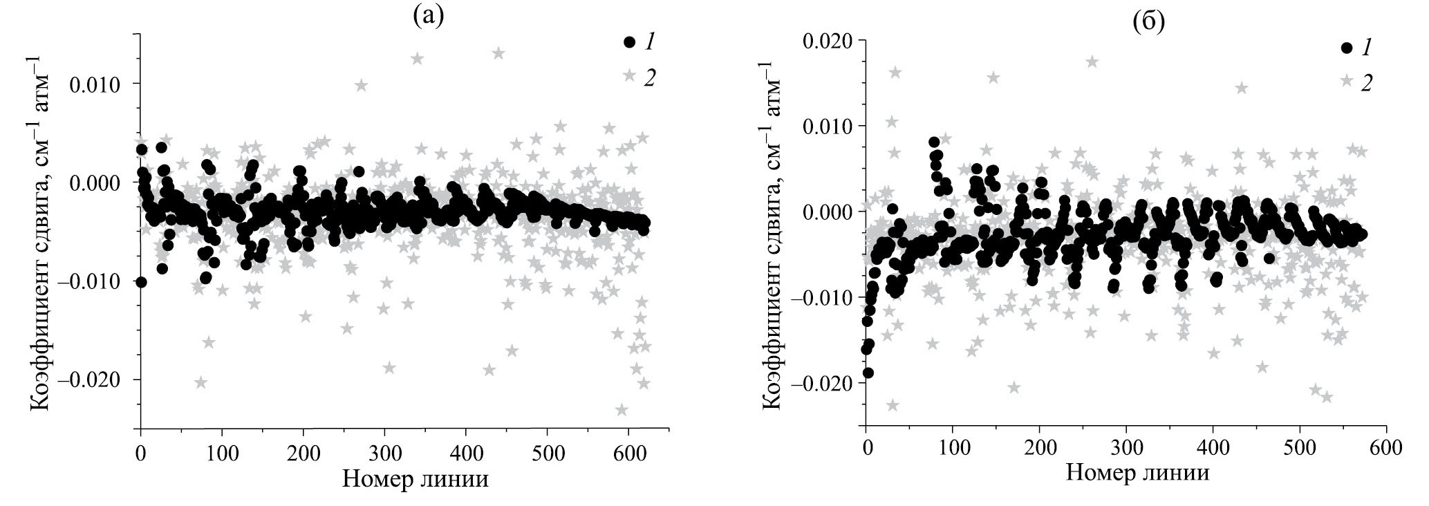 Около 90% всех экспериментальных сдвигов линий попадают в интервал от –0.01 до 0.005 атм–1. В целом, наблюдается хаотический разброс значений без четкой вращательной зависимости кроме нескольких случаев. В R-ветви при Ka = 0 (рис. 2а) значения сдвигов уменьшаются при увеличении J, такая же картина наблюдается и для рассчитанных сдвигов. В R-ветви при Ka = 1 (рис. 2б) для J > 20 данные как в эксперименте, так и в расчете слабо меняются от линии к линии, для меньших значений J в случае переходов с J = Ka + Kc–1 сдвиги линий уменьшаются, для переходов с J = Ka + Kc увеличиваются.