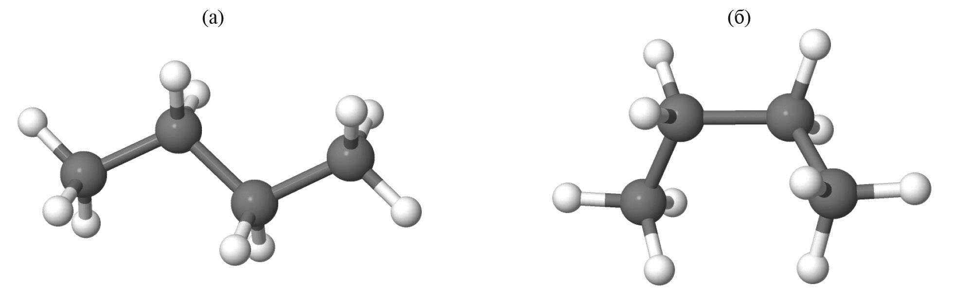 Рис. 1. Пространственная структура (а) транс- и (б) гош-конформеров н-бутана